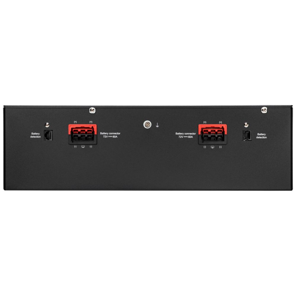 Le module est livré complet avec tous les accessoires nécessaires : câble de puissance batterie, câble de détection, kit de montage rack et plaque de montage. Son design noir et argent s'intègre parfaitement dans tout environnement professionnel.