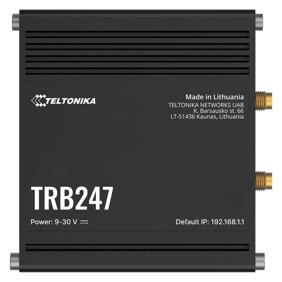 Conçu pour les environnements extrêmes avec une plage de température de -40°C à +75°C, le TRB247 dispose d'un boîtier en aluminium anodisé IP30. Sa consommation réduite (< 2.6W max) et son alimentation flexible 9-30 VDC en font une solution idéale pour les installations distantes.